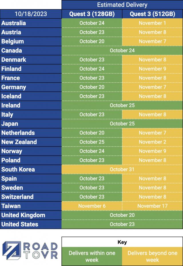 我們查看了從Meta.com直接購(gòu)買的Quest 3(128GB)和Quest 3(512GB)在所有銷售頭顯地區(qū)的庫(kù)存情況,最新數(shù)據(jù)顯示,大多數(shù)地區(qū)128GB型號(hào)將在一周內(nèi)發(fā)貨,但512GB型號(hào)需要一周或更長(zhǎng)時(shí)間才能發(fā)貨。