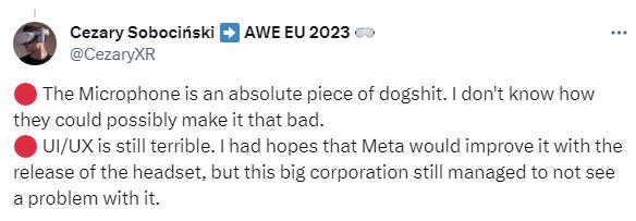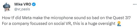 知名硬件達人Brad Lynch也表達了對Quest 3麥克風的失望,XRDdailyNews的Cezary Sobociński更是直言不諱稱Quest 3麥克風“絕對是狗屎”。