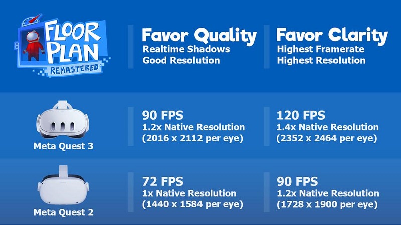 Turbo Button概述了「Floor Plan Remastered」Quest 2和Quest 3版本之間的性能差異,Quest 3版可達(dá)120FPS,以使玩家選擇“偏好質(zhì)量”選項(xiàng)以實(shí)現(xiàn)實(shí)時(shí)陰影,或“偏好清晰度”選項(xiàng)以實(shí)現(xiàn)更高的幀速率和分辨率。