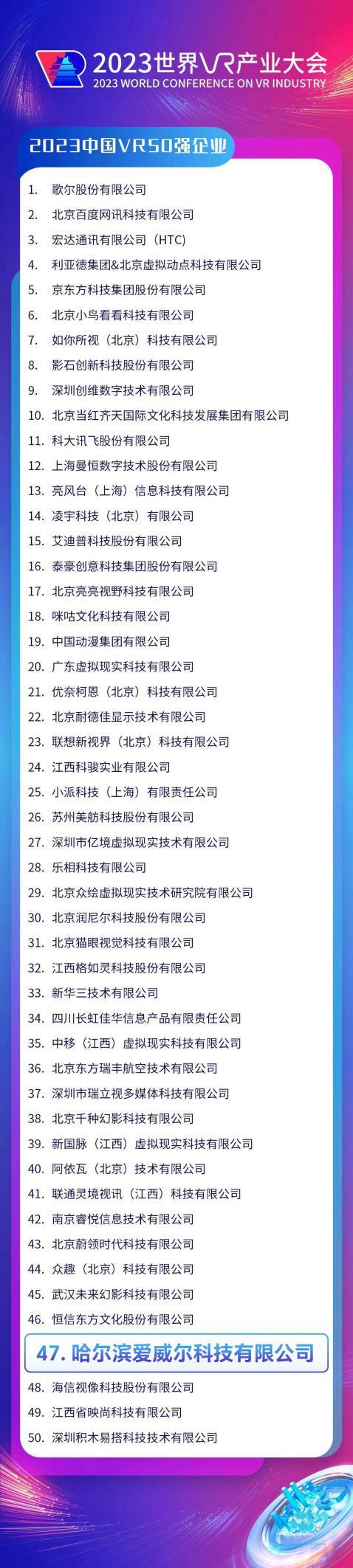 近期,由工業(yè)和信息化部、江西省人民政府主辦的2023世界VR產(chǎn)業(yè)大會在江西南昌圓滿落幕。哈爾濱愛威爾科技有限公司成為東北三省唯一入選的“2023中國VR50強企業(yè)”。