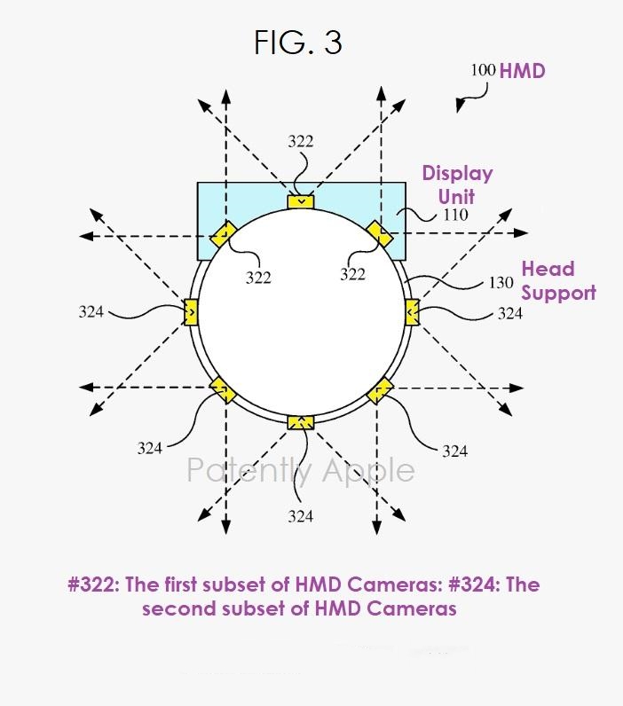 蘋(píng)果專(zhuān)利圖3示出了包括八個(gè)攝像頭的頭戴式顯示器,攝像頭的第一子集耦合到顯示單元#110,而攝像頭的第二子集耦合到頭部支架#130;連接到顯示單元#110的攝像頭(可稱(chēng)為顯示器安裝相機(jī)#322);那些連接到頭部支架(即第二子集)的攝像頭可稱(chēng)為支架安裝攝像頭#324。