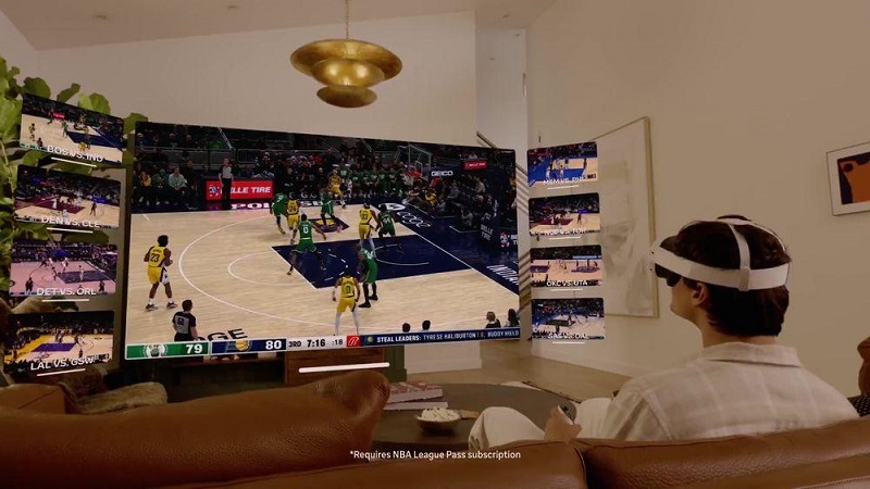 除了52場免費直播的180度沉浸式比賽,NBA League Pass訂閱者還可通過「Xtadium XR」“Multi-Game 模式”,在混合現(xiàn)實環(huán)境浮動2D虛擬電視屏幕上觀看任何比賽。此模式最多同時支持9場比賽,你還可以“在觀看比賽的同時查看最新球員統(tǒng)計數(shù)據(jù)”。