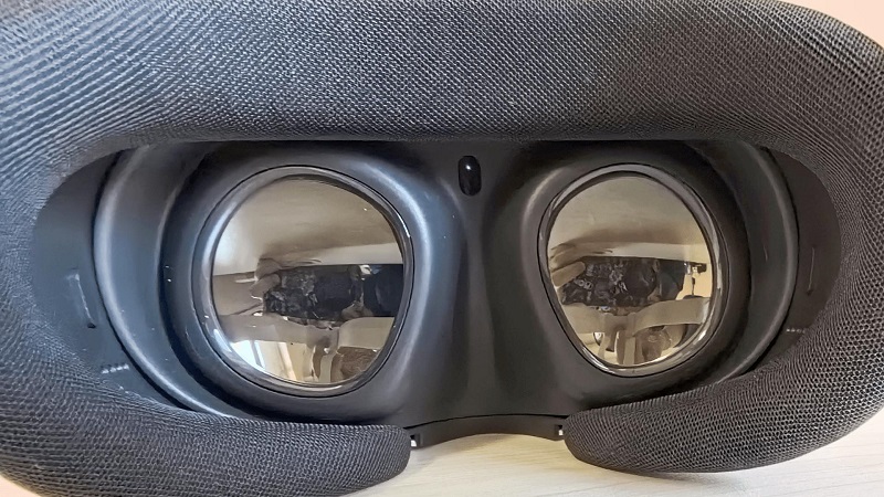 頭顯背面則是兩個碩大的Pancake鏡片和柔軟的面部護墊,護墊兩側(cè)各有一個并不醒目的小按鍵,按下按鍵的同時拉動護墊,即可調(diào)節(jié)護墊邊緣與鏡片的距離(也就是用戶臉部與鏡片的距離),這個全新設(shè)計非常有趣。面部護墊相對Quest 2面積更大,材質(zhì)也更柔軟,如果說Quest 2護墊給人的感覺是“梆硬”,那么Quest 3護墊的面部貼合感已經(jīng)與PICO 4做到了同樣的舒適。