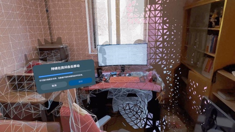 對于像我們這樣的普通用戶而言,直接使用這款產(chǎn)品就是感受MR體驗的最佳方式。初次啟動Quest 3,我們需要完成設(shè)備的激活,這里的操作方式與Quest 2一致,國內(nèi)用戶需要具備能夠“科學上網(wǎng)”的無線網(wǎng)絡(luò)環(huán)境,以保證Quest 3和安裝Meta Quest移動應(yīng)用的智能手機可以連接Meta的服務(wù)器。在激活設(shè)備之后,Quest 3會進行當前房間環(huán)境的掃描,我之前在體驗PS VR2的時候也有過類似經(jīng)歷——通過攝像頭看到外部環(huán)境正在被無數(shù)的多邊形進行覆蓋。