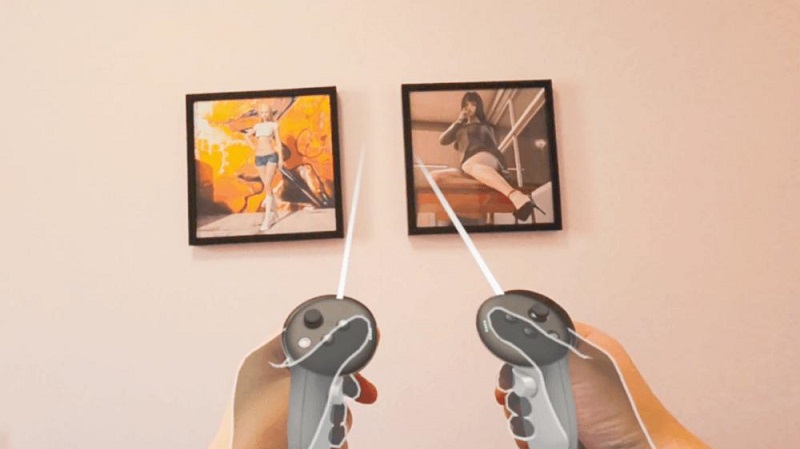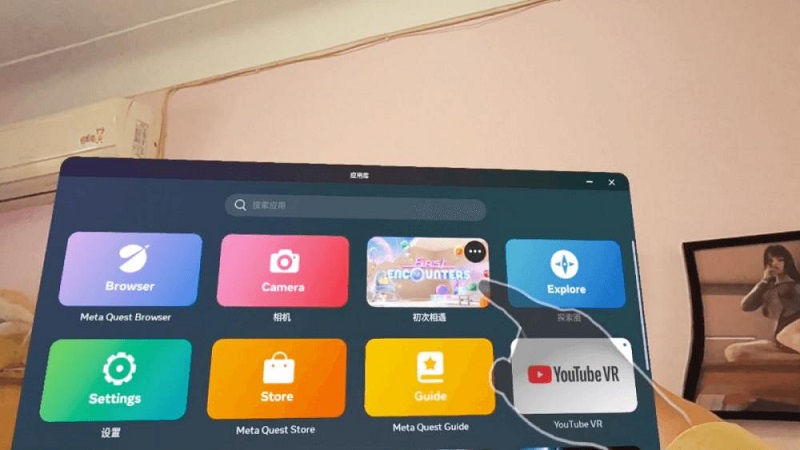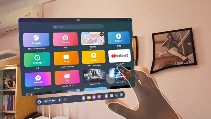 此時如果我想進行任何操作,就會有兩個選擇——手柄或手勢,下面先說手柄交互。在佩戴頭顯的情況下,只要拿起手柄,系統(tǒng)就會識別出來,而我不需要按下手柄上的任何按鍵。系統(tǒng)識別到手柄之后,一個神奇的現(xiàn)象發(fā)生了,在我眼前的真實世界中,我可以看到一對手柄和握著它們的我的手,不過這些都是虛擬圖像,真正的手柄和我的手被這些虛擬圖像覆蓋了,而且準確度極高,這種感覺其實就是MR體驗。接下來我按下手柄上的Home鍵,召喚出系統(tǒng)菜單,點擊菜單的各個圖標即可打開不同的窗口。此時這些菜單和窗口都是以一種平面圖層的方式顯示在我眼前的真實世界之中,用手柄延伸出來的射線可以移動它們的位置,而其它的操作與傳統(tǒng)的VR界面沒什么區(qū)別。點擊菜單上的一個圖標還可以切換回虛擬界面(也就是關(guān)閉透視模式)。