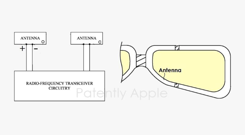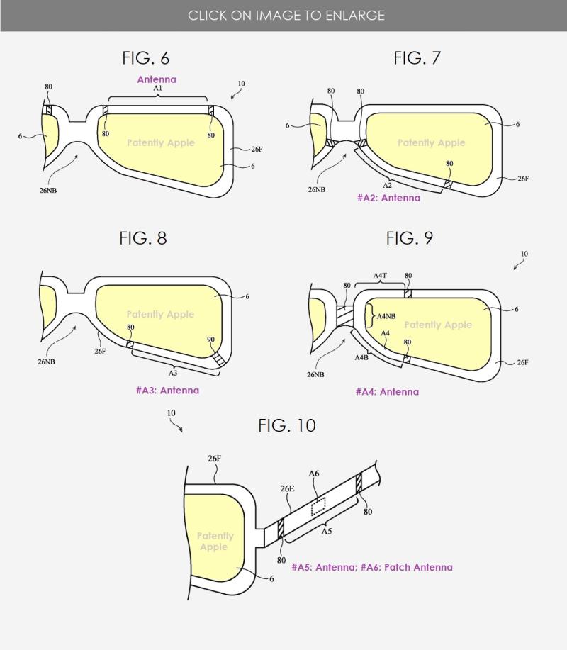 蘋果專利圖6、7、8和9是一副示例性智能眼鏡的前視圖,其中天線位于鏡框上的各個(gè)面部位置處;圖10是一副具有包括天線的細(xì)長側(cè)部(鏡腿或鏡臂)的智能眼鏡示意圖。