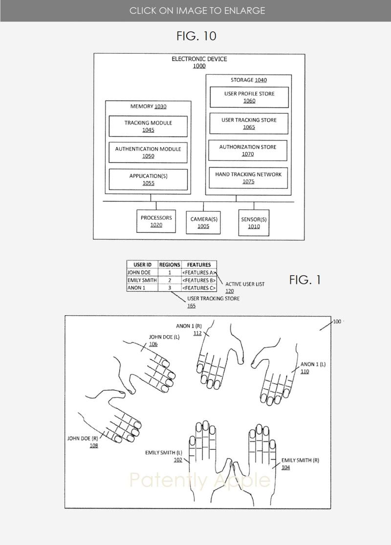 蘋果專利圖10以框圖形式示出了用于確認(rèn)手勢身份的示例性系統(tǒng);圖1示出了用于管理場景中活動用戶身份的系統(tǒng)設(shè)置。