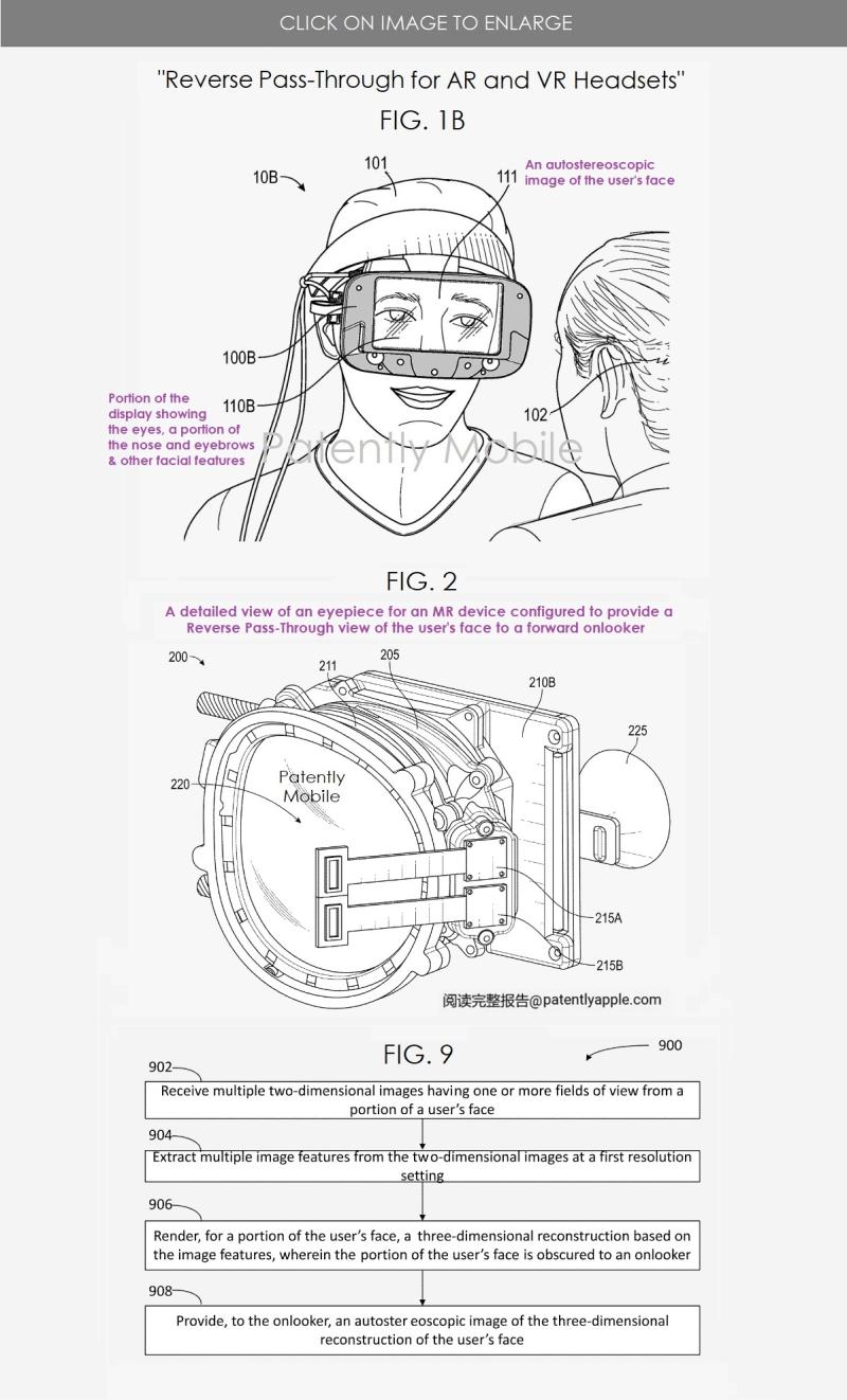 Meta專利圖1B示出了前旁觀者所看到的AR或VR設備的用戶;圖2示出了用于AR或VR設備的目鏡的詳細視圖,該目鏡被配置為向前方觀看者提供用戶面部的反向透視視圖。