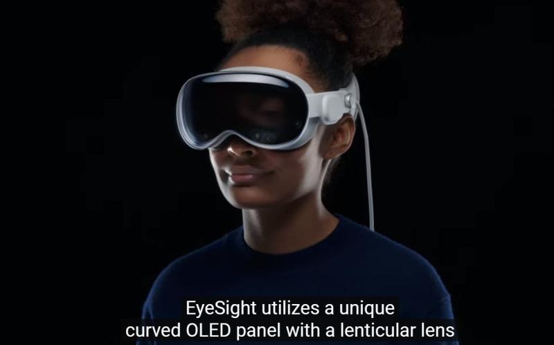 “我們認(rèn)真考慮了Vision Pro用戶如何與其他人進(jìn)行互動(dòng),EyeSight基于獨(dú)特的曲面OLED面板和雙凸透鏡,將用戶正確視角映射給其他人,其結(jié)果是使設(shè)備看起來(lái)仿佛是透明的?!?/p>