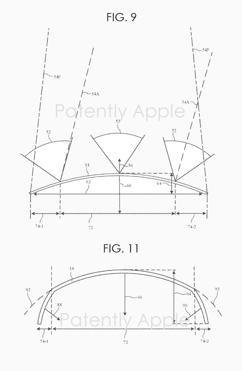 蘋(píng)果專(zhuān)利圖9為示例性彎曲柱鏡顯示器的橫截面?zhèn)纫晥D,示出了如何在顯示器的邊緣處包括非立體區(qū)域以呈現(xiàn)顯示器更大的曲率。