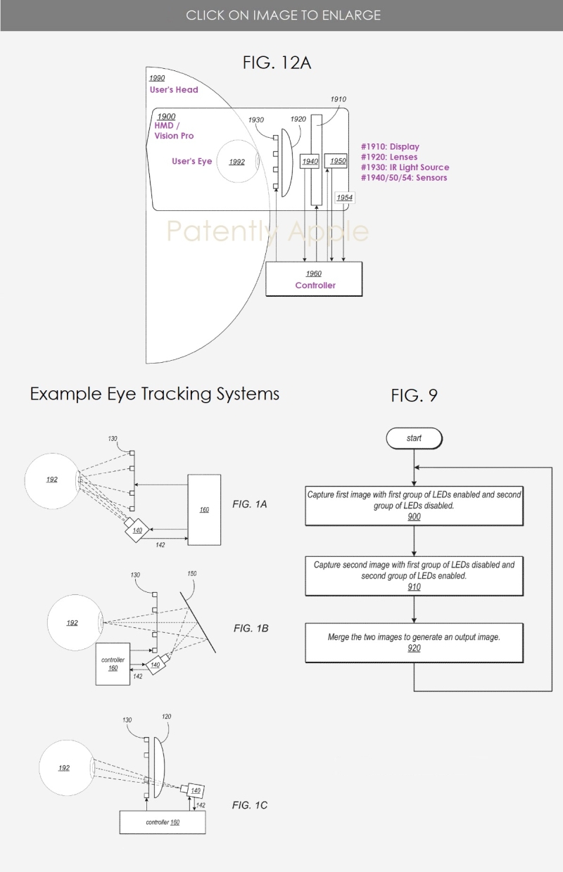 蘋果專利圖12A示出了示例頭戴式設(shè)備(HMD),其可包括如圖11和12A中所示的組件和解決方案1A-C;圖9為用于減輕輸出圖像遮擋方法的高級流程圖。