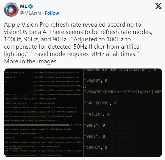 推特網友“M1 Astra”發(fā)現(xiàn)的代碼確認Vision Pro實際最大刷新率為100Hz,但100Hz是一種激活模式,僅用于“補償人工照明檢測到的50Hz閃爍”。