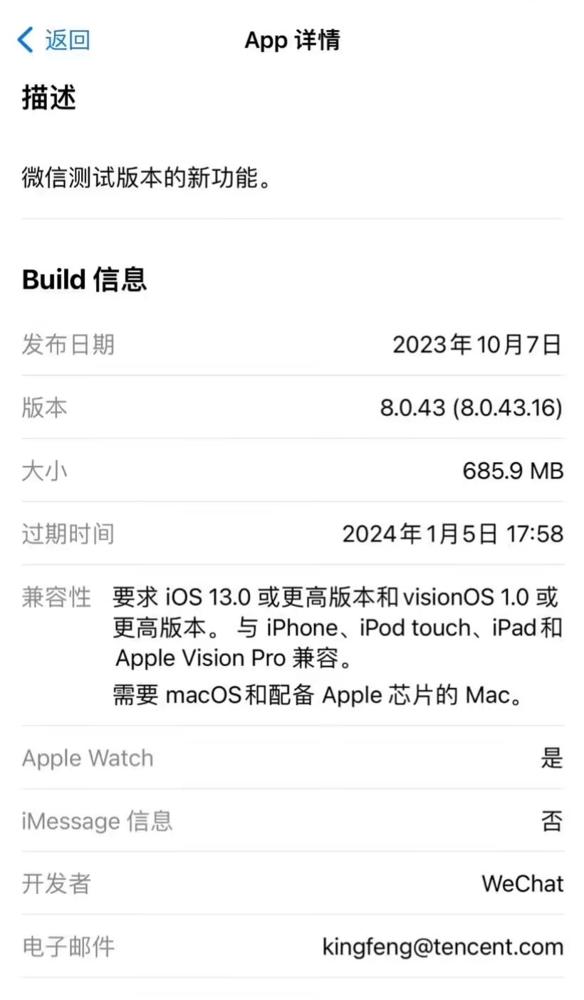 有微信用戶反饋,微信更新了iOS 8.0.43內(nèi)測(cè)版,該版本亮點(diǎn)是支持Apple Vision Pro。