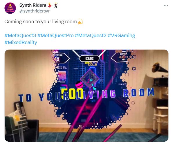 「Synth Riders」開發(fā)商、美國游戲工作室Kluge Interactive在Twitter分享了一段20秒混合現(xiàn)實游戲片段,并表示Quest 3更新“即將推出”。