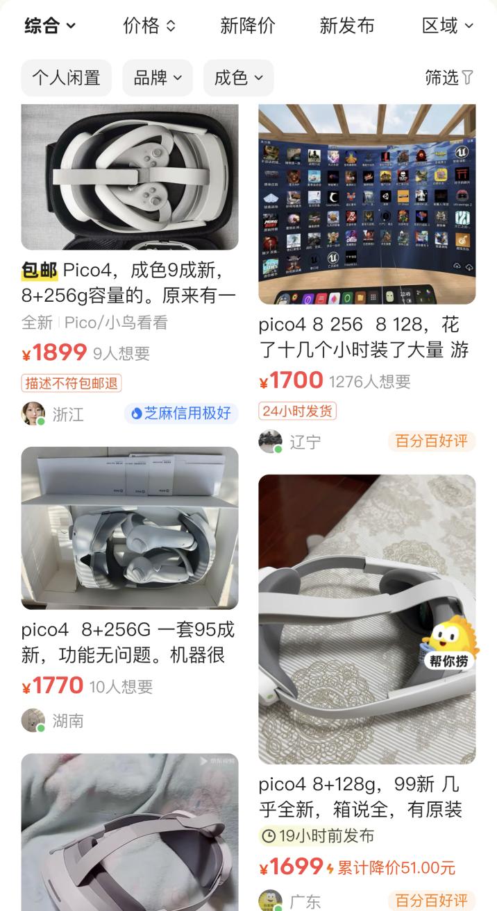 因此,許多抱著試一試的心態(tài)將PICO 4買回家的用戶,在嘗鮮過一系列入門級VR應(yīng)用后,想要更進一步體驗進階內(nèi)容時,卻發(fā)現(xiàn)偌大的應(yīng)用商店里竟很難找到一款能夠讓自己體驗超過2小時的應(yīng)用。相當(dāng)多的用戶吐槽PICO 4剛買回來沒多久就“吃灰”了,而當(dāng)筆者在二手交易平臺上進行搜索時,發(fā)現(xiàn)“99新”且低價轉(zhuǎn)讓的PICO 4幾乎數(shù)不勝數(shù)。