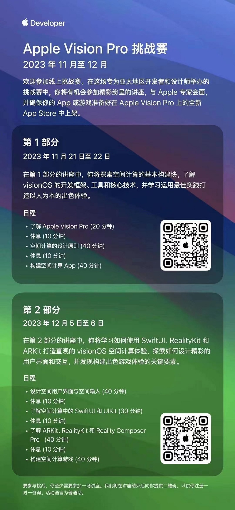 面向亞太地區(qū)開發(fā)者和設(shè)計(jì)師的“Apple Vision Pro線上挑戰(zhàn)賽”即將啟動(dòng),活動(dòng)共有兩場(chǎng)。其中第一場(chǎng)將于11月21日至22日召開,在講座中,你將能探索空間計(jì)算的基本構(gòu)建塊,了解visionOS開發(fā)框架、工具和核心技術(shù),并學(xué)習(xí)運(yùn)用最佳實(shí)踐打造以人為本的出色體驗(yàn);第二場(chǎng)活動(dòng)將于12月5日至6日召開,在講座中,你將學(xué)習(xí)如何使用SwiftUI、RealityKit和ARKit打造直觀的visionOS空間計(jì)算體驗(yàn),探索如何設(shè)計(jì)精彩的用戶界面和交互,并發(fā)現(xiàn)構(gòu)建出色游戲體驗(yàn)的關(guān)鍵要素。