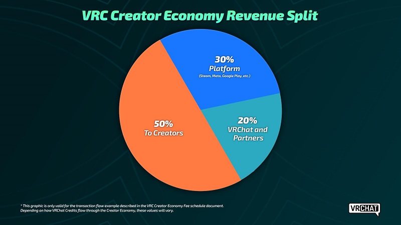 關(guān)于收入分成,VRChat透露,收入50%將分配給創(chuàng)作者,30%將用于支付Meta和Steam等個別平臺收取的費用,剩下的20%則留給VRChat及其合作伙伴。