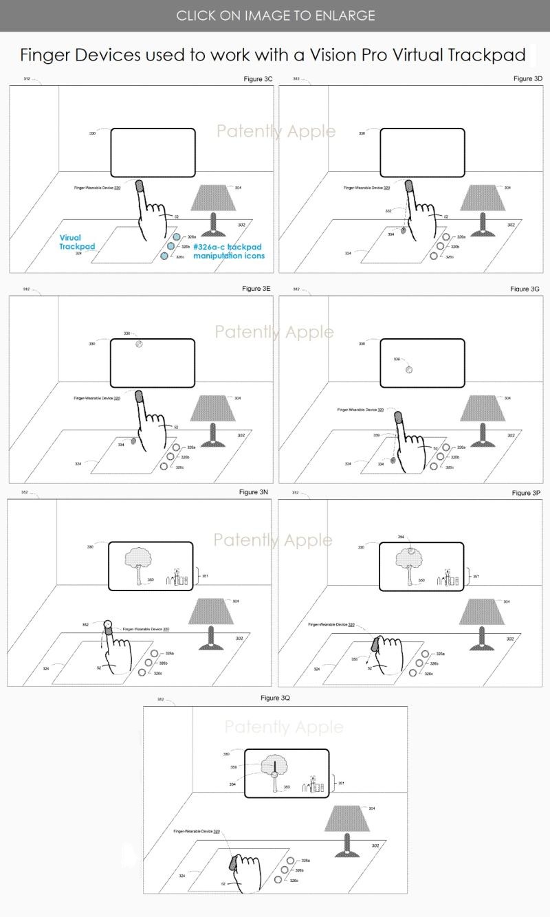 Apple Vision Pro支持用戶通過簡單手勢控制visionOS并與之交互。然而,有時(shí)可能需要額外的“控制器”來操控Apple TV內(nèi)容、游戲、演示或處理圖表文檔,因此,基于手指設(shè)備可操縱數(shù)據(jù)。如今,美國專利商標(biāo)局公布了蘋果一項(xiàng)專利申請,涉及在Vision Pro工作區(qū)虛擬觸控板上使用手指設(shè)備。