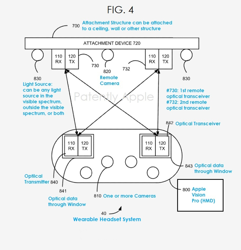 蘋果專利圖4是可穿戴頭顯系統(tǒng)(未來(lái)Vision Pro)#40,包括可穿戴頭顯#800、第一遠(yuǎn)程光收發(fā)器#730、第二遠(yuǎn)程光收發(fā)器#732、一個(gè)或多個(gè)遠(yuǎn)程攝像頭#820以及一個(gè)或多個(gè)光源#830。