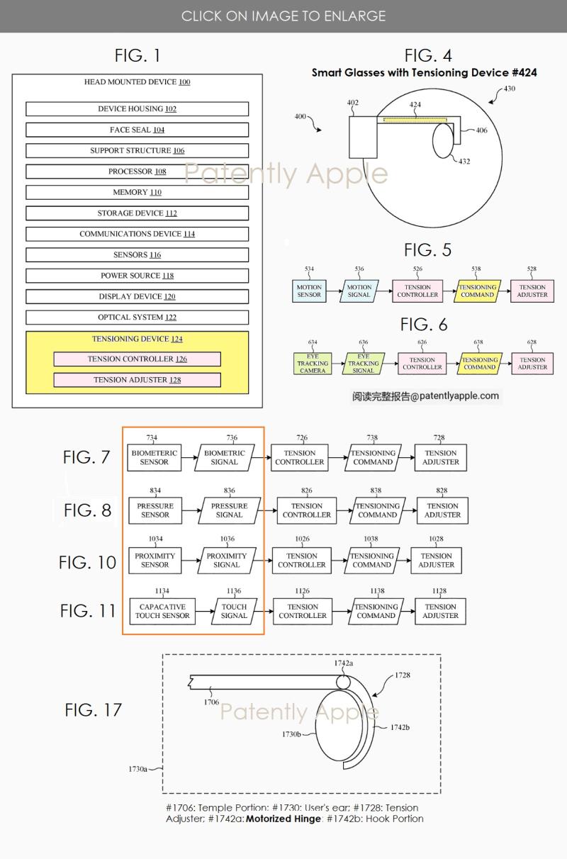 蘋果專利圖1為頭戴式設(shè)備硬件結(jié)構(gòu)框圖;圖4為具有眼鏡型頭戴式設(shè)備側(cè)視圖;圖5-8和10-11介紹了張緊控制器,每個控制器都涵蓋不同的方面,包括運動傳感器、眼動追蹤傳感器、生物識別傳感器、壓力傳感器、接近傳感器和電容式觸摸傳感器。