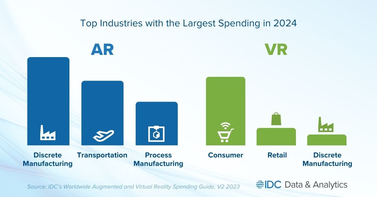 在VR方面,零售業(yè)將是支出最高的行業(yè)。在線零售展示徹底改變了客戶購物體驗(yàn),繼去年零售商將重點(diǎn)從客戶體驗(yàn)轉(zhuǎn)向盈利能力和成本控制后,在線零售展示將再次成為人們關(guān)注的焦點(diǎn)。支持客戶在購買前與虛擬3D產(chǎn)品互動(dòng)以及在家定制產(chǎn)品等創(chuàng)新極大提高了消費(fèi)者興趣。Apple Vision Pro、Meta Quest 3和Bigscreen Beyond將進(jìn)一步推動(dòng)VR支出,所有行業(yè)將在五年內(nèi)實(shí)現(xiàn)兩位數(shù)的復(fù)合年增長率。在商業(yè)領(lǐng)域,VR培訓(xùn)將成為來年最受歡迎的用例,技術(shù)進(jìn)步、遠(yuǎn)程團(tuán)隊(duì)需求和混合工作場所將推動(dòng)對(duì)VR協(xié)作的投資,到2027年,這將成為增長最快的VR用例。