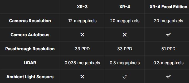 XR-4的顯示屏比Apple Vision Pro像素高出20%以上,并且直通攝像頭每秒輸出的像素數(shù)量是其兩倍多。用于生成動態(tài)遮擋和對象分割實時深度圖的激光雷達傳感器的分辨率也有顯著提高,使用的激光點數(shù)量幾乎是原來的八倍。