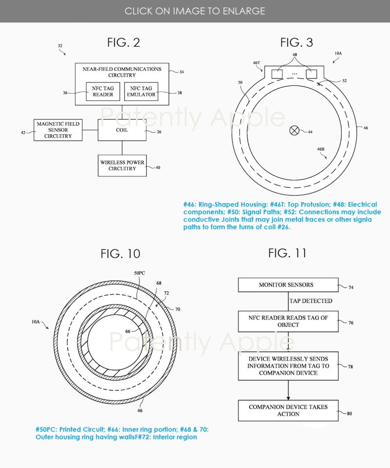 蘋果專利圖2是環(huán)形裝置的說明性電路的電路圖;圖3是設(shè)備#10A的前視圖。圖3所示,設(shè)備環(huán)可包括通過信號路徑#50互連的部件#48,信號路徑#50可形成在用作基板的一個或多個印刷和/或一個或多個其他介電構(gòu)件上(例如,由聚合物、玻璃、陶瓷等),其使用三維印刷(例如,以形成被稱為三維印刷電路板的三維基板)、模制、機(jī)加工和/或其他制造技術(shù)來成形。在一些實施例中,用于信號路徑的基板可由用于環(huán)的介電外殼的部分形成。