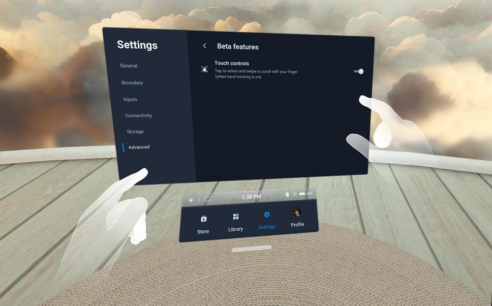 直接觸摸模式,稱為“觸摸控制”(Touch Controls),使系統(tǒng)界面變得更小,并且離用戶更近,因此用戶可以直接用手點(diǎn)擊和滾動(dòng)界面,如同觸摸屏操作一般,目前,該功能僅適用于手部追蹤。