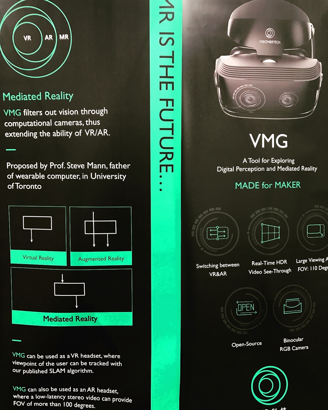 概念上來講,MR囊括并超越了VR與AR的范疇,由“穿戴電腦之父”Steve Mann教授提出。而易瞳VMG系列,則為全球首款基于視頻透視技術(shù)的MR智能眼鏡。VMG通過雙目攝像頭采集現(xiàn)實畫面進行實時渲染,可以在采集到的現(xiàn)實畫面上疊加部分虛擬數(shù)字信息實現(xiàn)AR,也可完全疊加實現(xiàn)VR,還可以對數(shù)字化的“現(xiàn)實”進行增減改變,從而帶來比單純的VR/AR頭顯更令人驚喜的應(yīng)用。