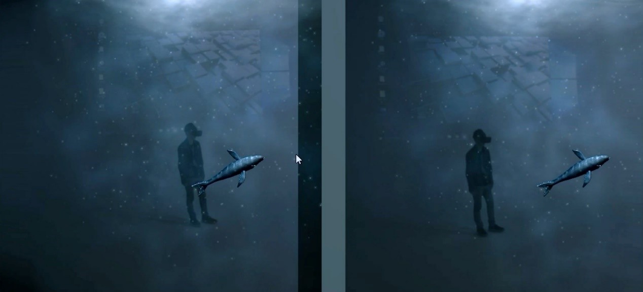 為了創(chuàng)造出更好的效果體驗,易瞳此次帶去了Deep Ocean和鏡中世界兩個Demo展示。Deep Ocean Demo中,MR智能眼鏡通過SLAM對你所在的現(xiàn)實空間進行即時定位與建圖,直接將你看到的現(xiàn)實空間實時渲染成靈動的海水。視頻透視技術(shù)支持下,一只深海大鯨魚以110°大視角的AR畫面呈現(xiàn),體驗者可近距離的觀察到大鯨魚從自己身邊游過,效果十分震撼。