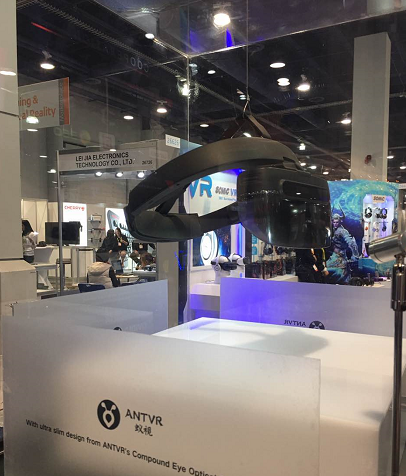 今天小編在蟻視展臺(tái)終于看到了這款神秘的產(chǎn)品(遺憾的是并不能體驗(yàn)),外觀與之前曝光的圖片差別不大,圓形頭戴,前面是類似HoloLens的半透明玻璃,并有貌似Leap Motion手勢(shì)識(shí)別模塊。最吸引小編的是鏡片部分,目測(cè)是由多個(gè)透鏡組成的透鏡陣列組合,這與目前市面上所有的VR/AR類產(chǎn)品的透鏡完全不同,難道這就是蟻視搞出來(lái)的“復(fù)眼”鏡片?