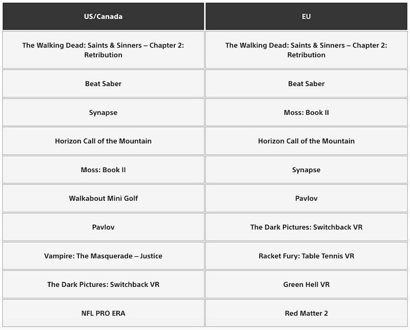 排名第一的是喪尸生存游戲「行尸走肉:圣徒與圣徒罪人 2」,其次是「Beat Saber」。 PS VR 2獨占游戲「Synapse」和 VR冒險游戲「Moss: Book II」分列第三和第五位。其他玩家最喜愛的游戲如「Pavlov」、「Walkabout Mini Golf」和「The Dark Pictures:Switchback VR」也緊隨其后。