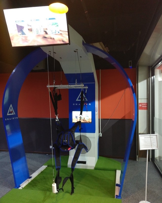 看到這個項目的具體形態(tài),感覺與我之前體驗過的一些模擬飛行的項目有點類似。據(jù)工作人員介紹,這一項目結(jié)合了Oculus Rift CV1 VR頭顯、真實跳傘傘包、微軟Kinect體感終端和鼓風(fēng)機等設(shè)備,力求讓用戶在使用過程中獲得真實的跳傘體驗。