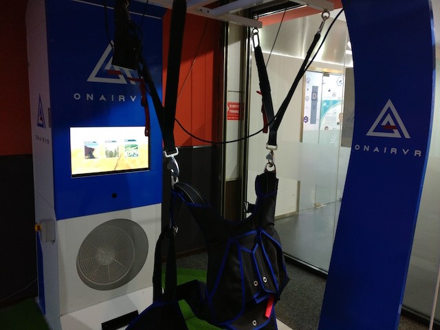 這個項目一共有三張地圖可以選擇,根據(jù)工作人員的建議,我開始選擇了美國科羅拉多大峽谷。在開始體驗之前,工作人員幫我將傘包牢牢系好,當(dāng)時我還很奇怪,為什么要系得這么緊,等體驗一開始我馬上就明白了。戴上VR頭顯,我看到“自己”坐在一架飛機的座艙之中,隨著艙門打開,我“跳出”了飛機,緊接著我的身體就變成了浮空姿勢(通過設(shè)備的懸掛系統(tǒng))。四周是高空,腳下是大峽谷,作為一名恐高癥患者,我確實非常緊張,那時候工作人員提醒我,可以通過我的雙手在空中調(diào)整姿勢,而我也開始慢慢嘗試“在空中”體驗飛一般的感覺。