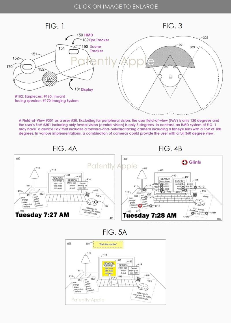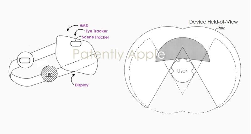 蘋果專利圖1展示了包括朝外成像系統(tǒng)#170的頭戴式顯示設(shè)備透視圖;眼動儀#182;場景跟蹤器#190;和耳機/揚聲器#152;圖3示出了根據(jù)一些實施方式的各種視場。