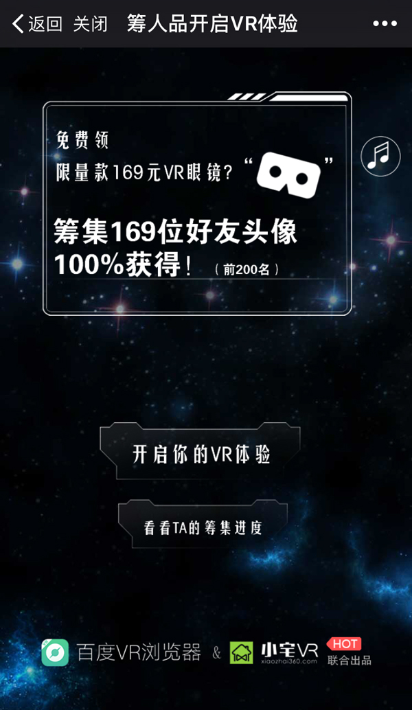 當(dāng)不少人聽見“要邀請(qǐng)169個(gè)微信好友才能獲得VR眼鏡”這個(gè)規(guī)則之后,不少人覺得門檻高、很難實(shí)現(xiàn),但是百度VR瀏覽器此次推出的“籌人品開啟VR體驗(yàn)”的H5活動(dòng),卻打破了這個(gè)認(rèn)知。