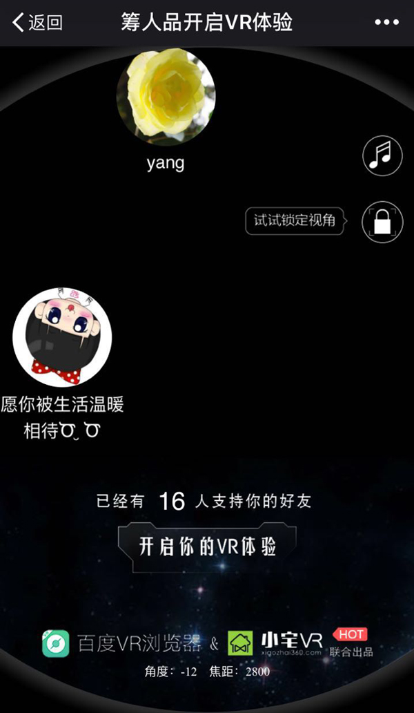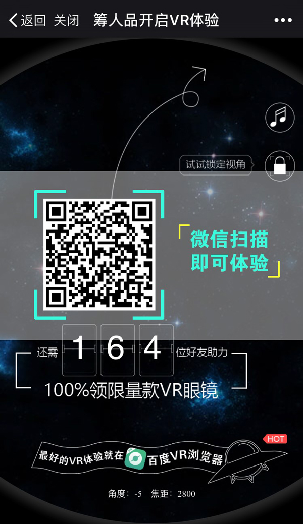 百度VR瀏覽器此次推出的“籌人品開啟VR體驗(yàn)”H5活動(dòng),每個(gè)參加的用戶,都可以邀請(qǐng)169位微信好友助力,其中前200名100%領(lǐng)取169元百度VR瀏覽器定制款小宅Z4 VR眼鏡。活動(dòng)類似常見的互聯(lián)網(wǎng)產(chǎn)品拉新方式,但是這個(gè)H5采用了創(chuàng)新的VR全景模式,很符合百度VR瀏覽器的特色——能夠?qū)崿F(xiàn)VR環(huán)境下的網(wǎng)頁(yè)瀏覽、裸眼看VR等功能。
