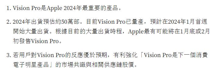 郭明錤表示,Vision Pro目前已進(jìn)入量產(chǎn)階段,批量發(fā)貨將于2024年1月第一周開始,預(yù)計2024年出貨量約為50萬臺。若用戶對Vision Pro的反應(yīng)優(yōu)于預(yù)期,這有利于強化“Vision Pro是下一個消費電子明星產(chǎn)品”的市場共識與相關(guān)供應(yīng)鏈股價。
