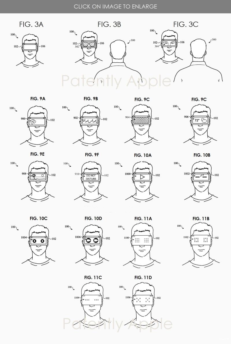 蘋果專利圖10A-10D示出了傳達(dá)關(guān)于頭顯用戶100和/或頭顯用戶與虛擬現(xiàn)實(shí)和現(xiàn)實(shí)世界環(huán)境交互狀態(tài)信息的符號視覺輸出示例。圖10A-10D是面向外顯示屏的通信示例,以傳達(dá)可幫助改善頭顯用戶100和外部觀察者之間交互的一組概念。