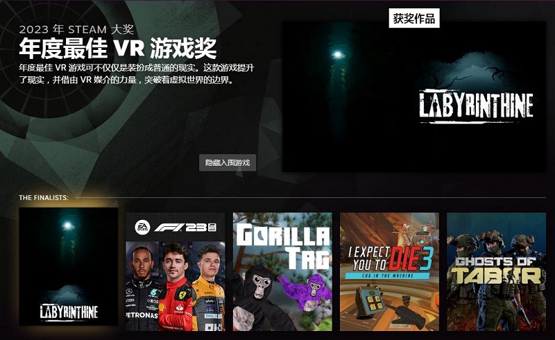 在玩家千呼萬喚之下,2023 Steam大獎獲獎名單正式公布,其中受到玩家矚目的“年度最佳VR游戲”(「Ghosts of Tabor」、「F1? 23」、「Gorilla Tag」、「I Expect You To Die 3: Cog in the Machine」、「Labyrinthine」入圍)由多人協(xié)作VR恐怖游戲「Labyrinthine」奪得。