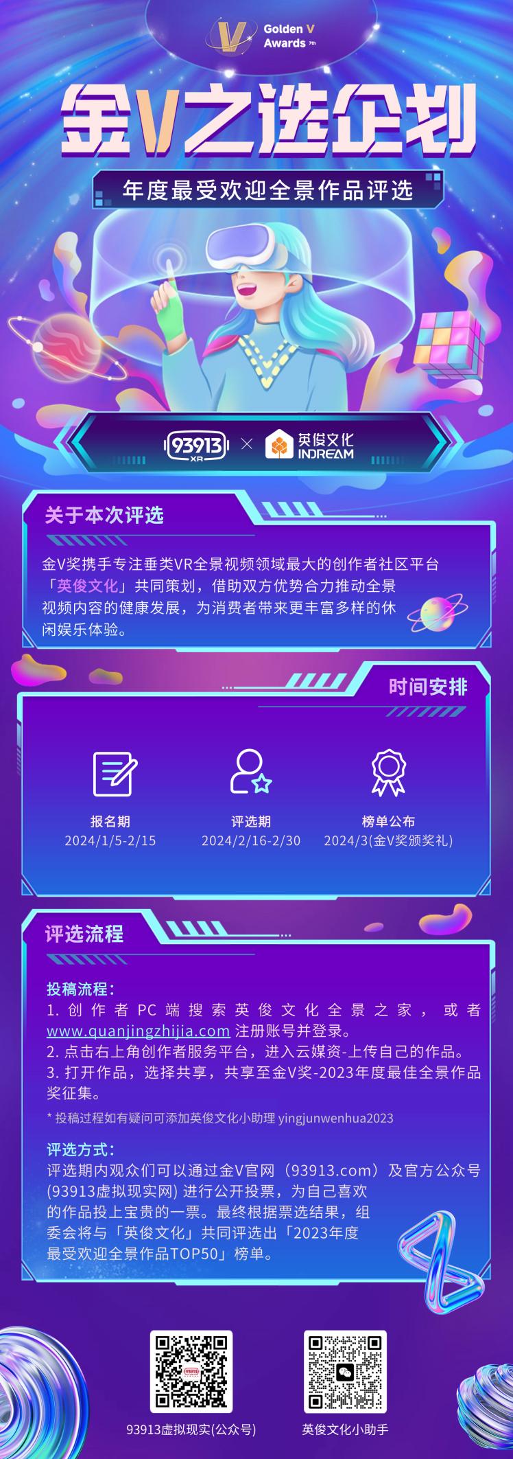 本屆「金V獎(jiǎng)」年度最佳全景作品評(píng)選的投稿報(bào)名通道將在2024年1月5日開(kāi)啟,并于2024年2月15截止。創(chuàng)作者們可以通過(guò)英俊文化官方渠道進(jìn)行投稿報(bào)名(網(wǎng)頁(yè)訪問(wèn)www.quanjingzhijia.com或掃描下方二維碼進(jìn)入報(bào)名頁(yè)面)。