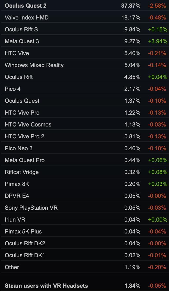 近日,Steam平臺公布了2023年12月的軟件與硬件調(diào)查報告。本月報告數(shù)據(jù)顯示,Steam平臺VR用戶占比微降至1.84%(-0.05%)。其中用戶占比變化最大的硬件分別是Meta Quest 2(37.87%,-2.58%)和Meta Quest 3(9.27%,+3.94%)。這一數(shù)據(jù)表明,有越來越多的老用戶已經(jīng)開始從Quest 2平臺向著分辨率更高的Quest 3平臺遷移,其他品牌的硬件占比則基本保持穩(wěn)定。