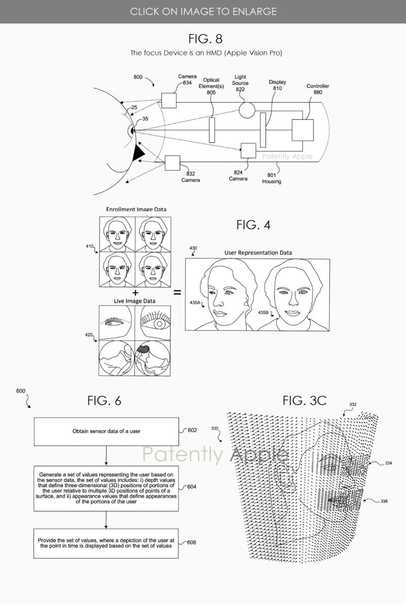 蘋(píng)果專利圖8說(shuō)明了創(chuàng)建逼真3D化身的關(guān)鍵設(shè)備是Apple Vision Pro(HMD),該專利也適用于iPhone、iPad和Mac;圖4示出了生成和顯示用戶面部的部分示例。