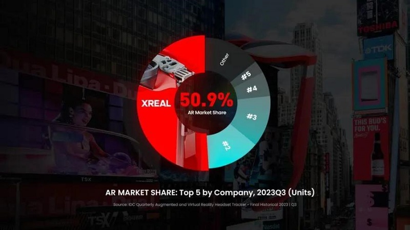 國產(chǎn)AR眼鏡廠商XREAL宣布已售出了35萬副AR眼鏡,是亞馬遜智能眼鏡類別中最暢銷的產(chǎn)品,預(yù)計占據(jù)全球AR眼鏡市場近45%份額。IDC數(shù)據(jù)顯示,XREAL在2023年第三季度占據(jù)了AR市場51%的市場份額。事實上,根據(jù)IDC數(shù)據(jù),XREAL實際上占到2023年整個消費AR市場出貨量同比增長的58%。