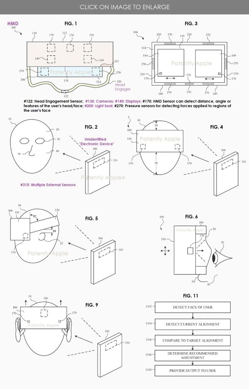 蘋果專利描述的系統(tǒng)可為頭戴式設(shè)備提供接口元素,從而為頭戴式設(shè)備的最佳放置提供指導(dǎo)。例如,頭戴式設(shè)備和/或另一設(shè)備可包括用于檢測(cè)用戶面部特征、佩戴時(shí)分布在面部上的力和/或與面部(例如,眼睛)對(duì)準(zhǔn)的傳感器。通過進(jìn)一步的示例,頭戴式設(shè)備和/或另一設(shè)備可以檢測(cè)調(diào)節(jié)的變化并且基于這種變化的頻率和/或幅度來推斷用戶不適。