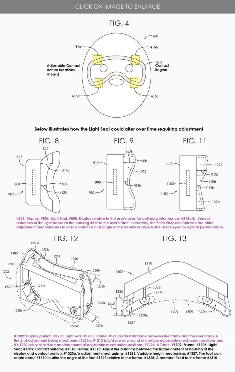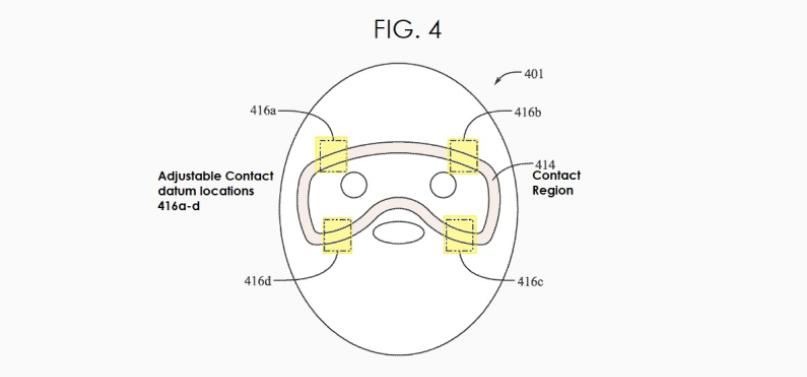 蘋果專利圖4示出了覆蓋用戶面部的頭戴式設(shè)備的接觸區(qū)域示例。接觸區(qū)域#414表示用戶臉部可能被本文描述的各種光密封接觸的區(qū)域覆蓋。接觸區(qū)域包圍用戶的眼睛,使得經(jīng)由一個(gè)或多個(gè)設(shè)備和顯示器投射到用戶眼睛的光與外部環(huán)境的環(huán)境光隔離。接觸區(qū)域還可延伸穿過(guò)用戶鼻梁并且被成形為符合鼻子上方、臉頰上以及用戶眼睛周圍到前額的面部版式,如圖所示。