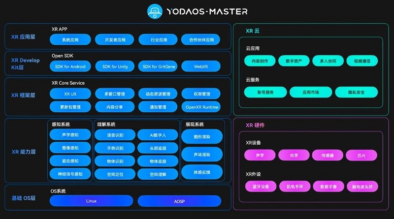 在此背景下,Rokid以超前的技術(shù)布局與深入的生態(tài)思考,推出了空間操作系統(tǒng)YodaOS-Master,為AR生態(tài)的繁榮打開全新篇章。系統(tǒng)軟件作為AR生態(tài)閉環(huán)的關(guān)鍵環(huán)節(jié),其重要性不言而喻。Rokid公司圍繞感知、理解、交互、展現(xiàn)、協(xié)同和數(shù)字創(chuàng)作六大核心方向,從芯片優(yōu)化、硬件設(shè)計(jì)、軟件架構(gòu)到AR算法以及創(chuàng)作工具等維度,進(jìn)行了全方位的升級(jí)與革新。YodaOS-Master作為目前國內(nèi)最為完整的一套面向空間計(jì)算時(shí)代的國產(chǎn)空間操作系統(tǒng),不僅為用戶帶來了前所未有的空間體驗(yàn),更為開發(fā)者提供了從硬件、基礎(chǔ)層、平臺(tái)層直至應(yīng)用層的全鏈路服務(wù)。