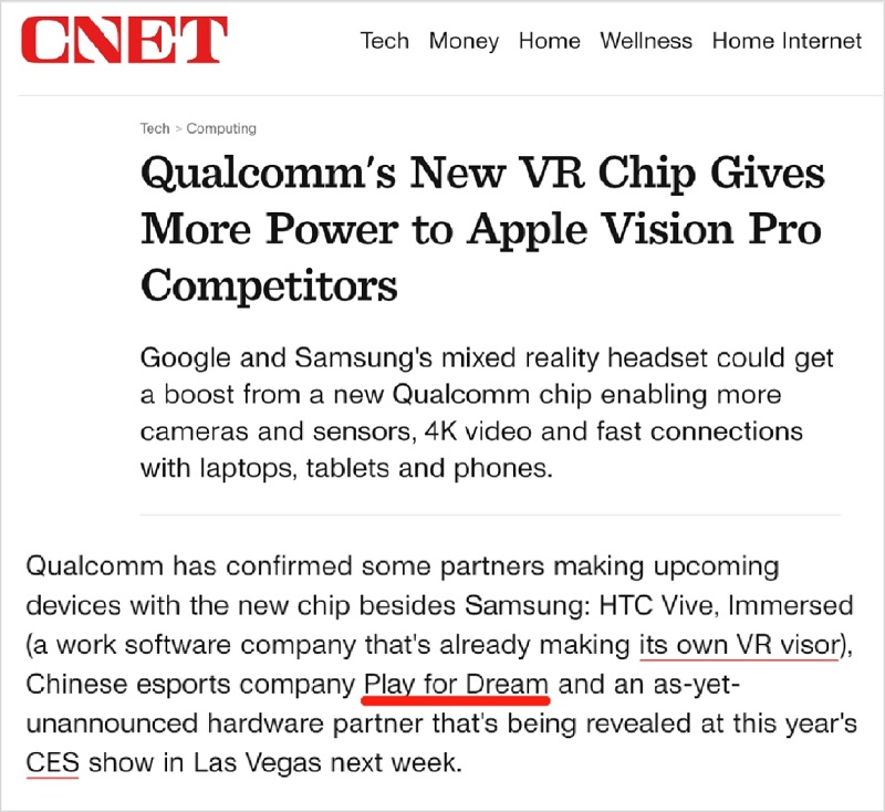 1月8日,芯片巨頭高通公布了其驍龍XR2+ Gen 2芯片的合作廠商名單,除三星等國際知名品牌之外,還有一家國內(nèi)空間計算領(lǐng)域的黑馬企業(yè)——玩出夢想科技位列其中,將在今年發(fā)布的新品中率先搭載。