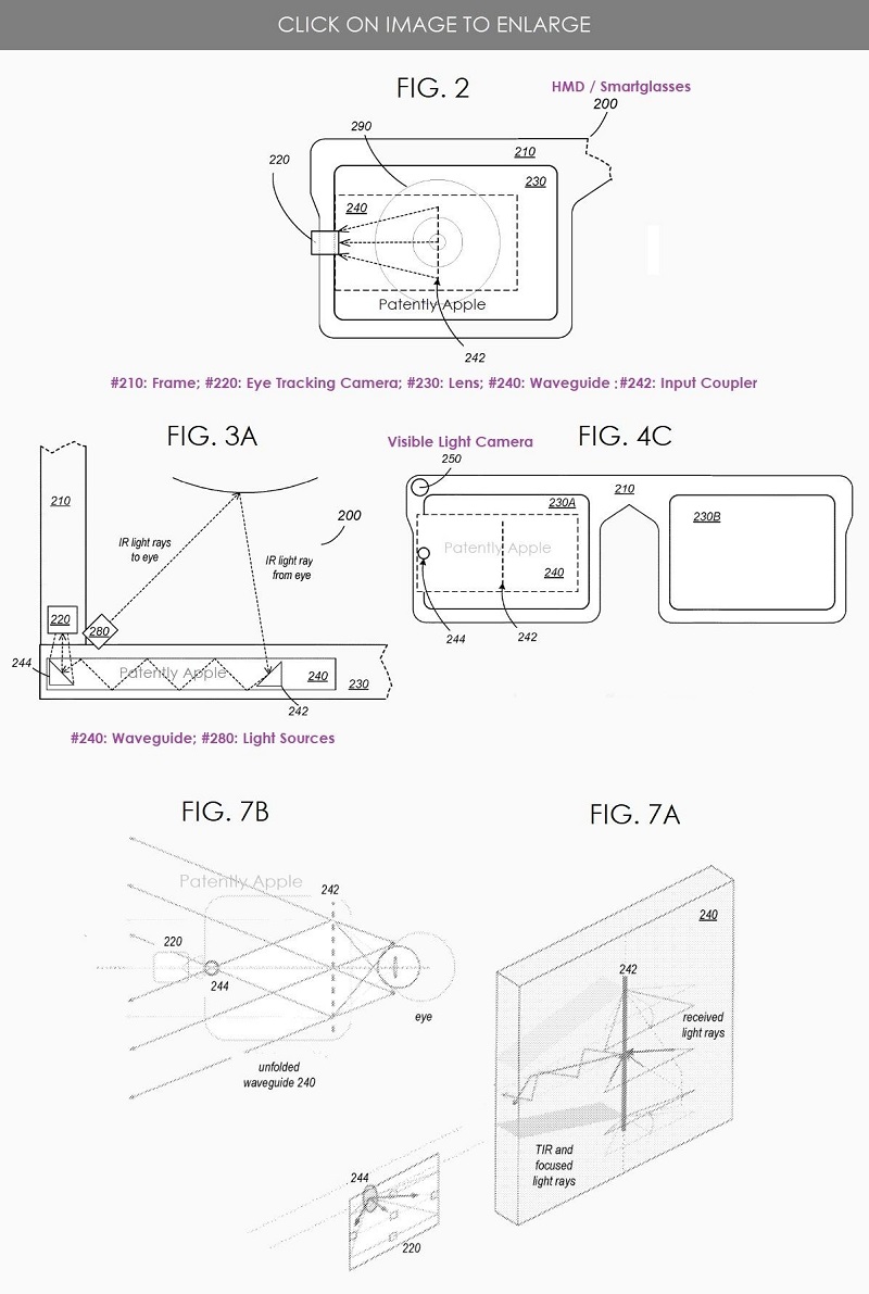 蘋果專利圖3A說明了輸入耦合器#242使用衍射或反射來改變光線角度,以便光線通過波導(dǎo)#240內(nèi)的全內(nèi)反射(TIR)重定向至輸出耦合器#244。輸入耦合器可被選擇為使得它僅影響由光源#280發(fā)射的光譜紅外(IR)部分內(nèi)的范圍(例如,~850或~940納米)?;蛘邔?duì)光譜的可見部分內(nèi)的光沒有影響,使得用戶對(duì)環(huán)境的觀察以及HMID顯示組件的輸出不會(huì)受到負(fù)面影響。重定向的紅外光線由輸出耦合器重定向到位于HMD框架 #210上某處的眼睛追蹤相機(jī)#220。