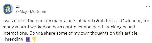 另一位在Owlchemy Labs工作多年、負責手柄和手部追蹤交互的前Owlchemy Labs開發(fā)人員也參與了討論。他基本上同意Reimer的觀點,并表示手部追蹤的成功性很大。
